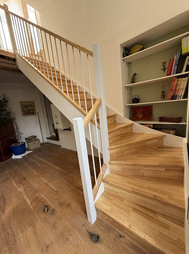 Escalier hévéa limons peints en blanc RAL 9003 barreaux verticaux 16 mm