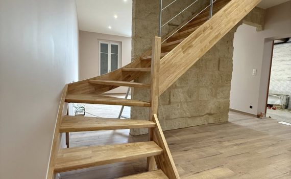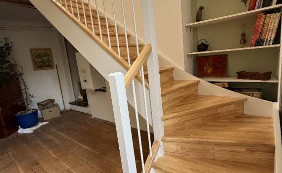 Escalier en châtaignier barreaudage bois et bibliothèque