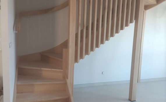 Escalier en châtaignier massif avec claustras, vernis extra mat