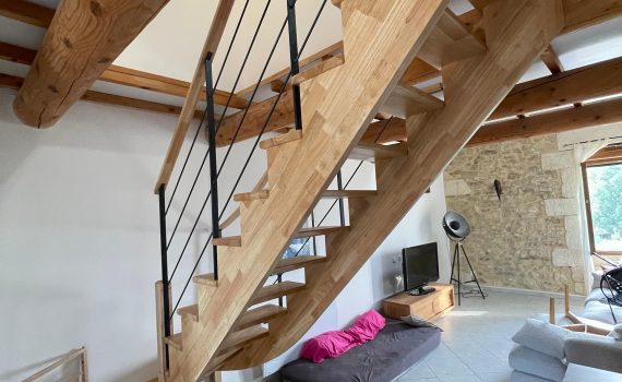 Escalier en frêne limons peint en noir sans contre marche, rampe horizontale étirés 8 mm livé et posé par nos soins à Nîmes