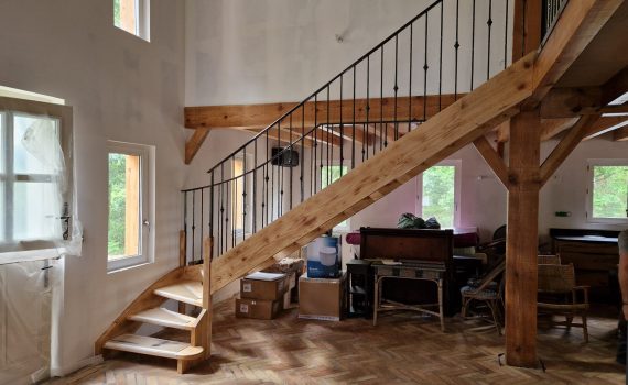 Escalier en frêne,vernis naturel, rampes barreaux 16 mm verticaux noir …