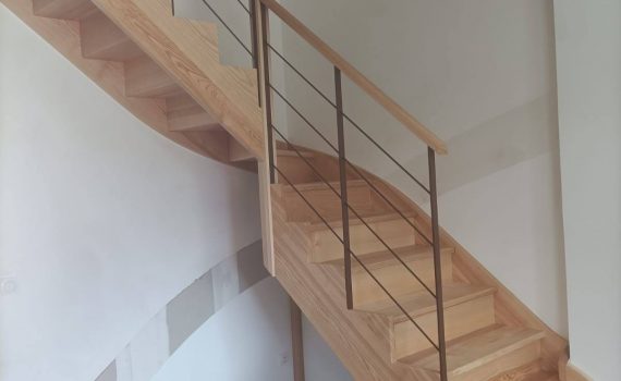 Escalier hévéa,sans contre marche ,limons peint en blanc RAL 9003 rampe métal étirés horizontaux 8mm main courante bois