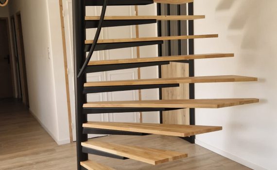 Escalier hèlicoÏdal structure métallique,avec marches hévéa vernis naturel. Rampant métallique débillardé ,garde-corps métallique. Finition peinture polyuréthane.