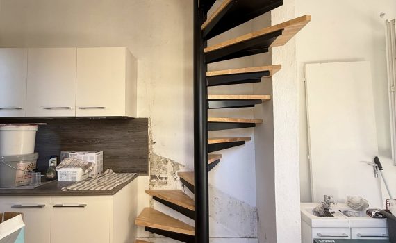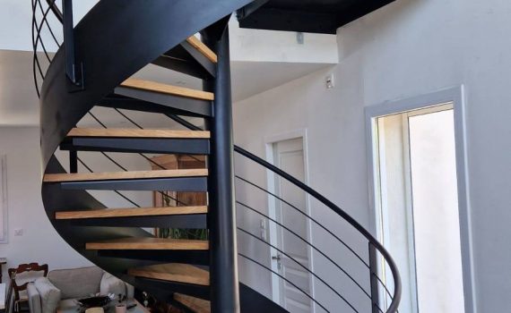 La pose du jour: Un escalier hélicoïdal en métal noir avec son garde-corps sur la commune de Clarensac dans le Gard.
