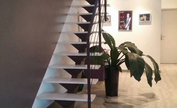 Escalier 1 quart tournant limon métallique ,marche hévéa vernis naturel avec garde-corps métallique finition peinture polyuréthane .