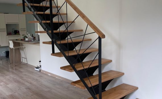 Escalier métal limon déporté,marches en frêne ,rampe et garde-corps, métal …