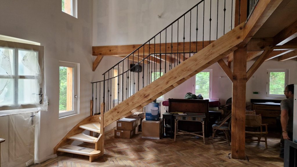 Détails : Escalier 1 quart tournant en châtaignier aspect vieilli au chalumeau, rampes avec barreaux métal verticaux 499.1 + garde-corps et marches en châtaignier vernis extra mat fabriqué, livré et posé par nos soins à Rion-Des-Landes (40).