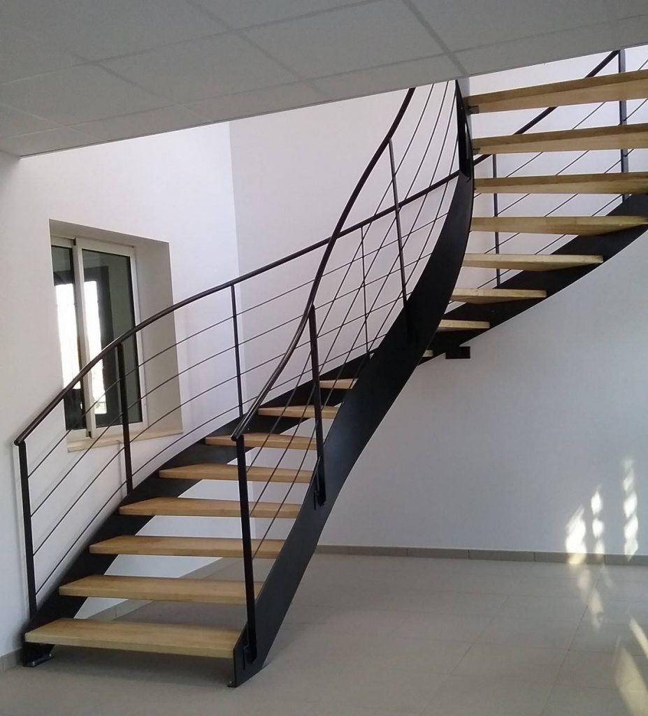 Escalier 2 quarts tournant limon métallique à la française ,marche hévéa vernis naturel, avec garde-corps métallique débillardé finition peinture polyuréthane.