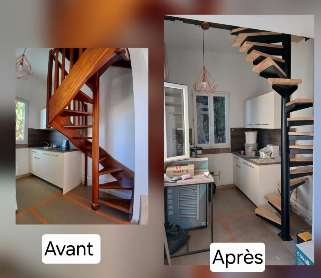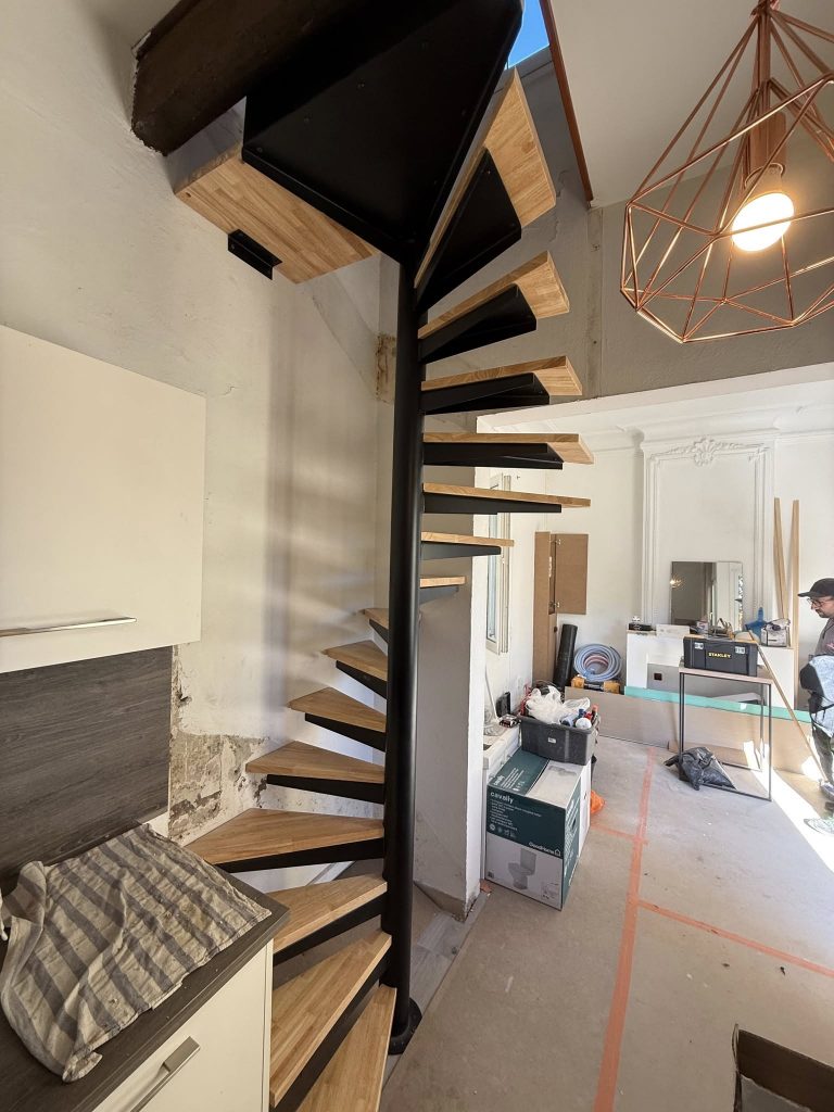 Escalier colimaçon, métal marches en hévéa fabriqué, livré et posé par nos soins dans le centre ville historique de Nîmes.