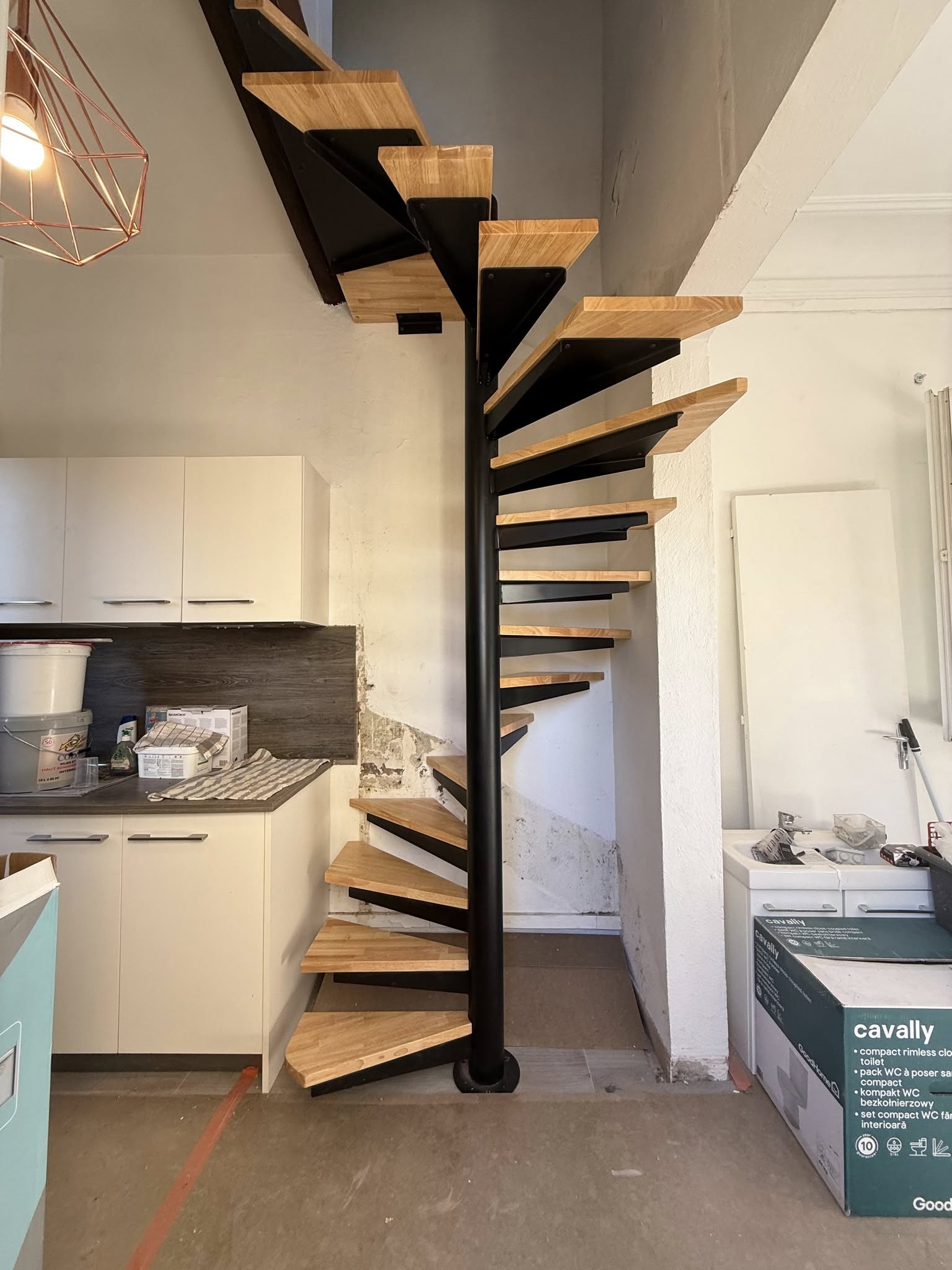 Escalier colimaçon, métal marches en hévéa fabriqué, livré et posé par nos soins dans le centre ville historique de Nîmes.