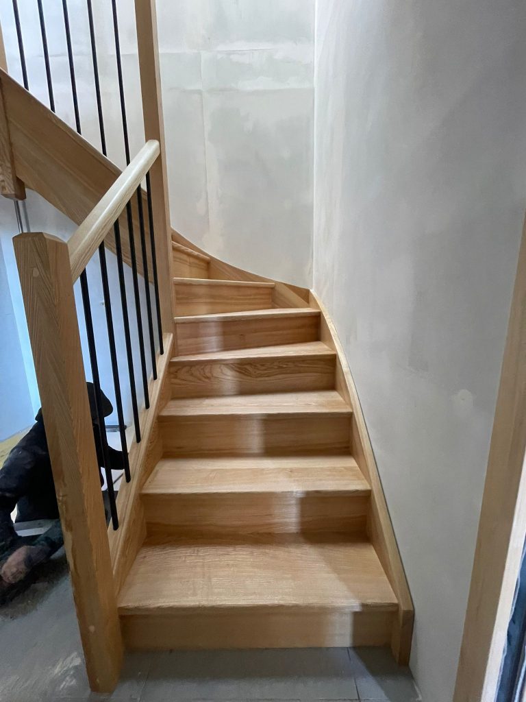 Escalier en frêne,vernis naturel, rampes barreaux 16 mm verticaux noir Ral 9005