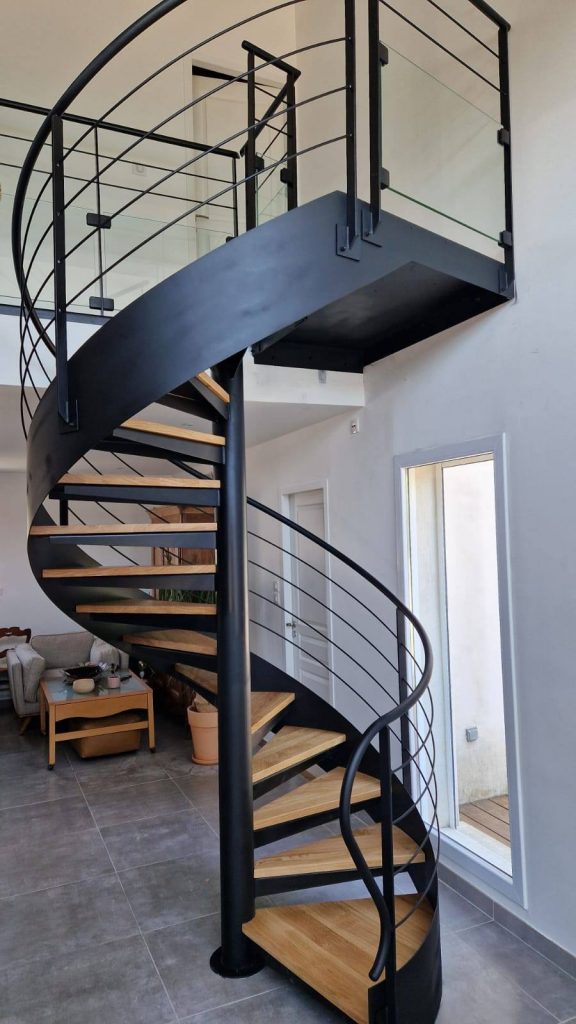 Escalier hélicoïdal rond avec limon extérieur marches en chêne garde-corps panneaux verre feuilleté 66/2 fabriqué, livré et posé par nos soins à Saint Laurent d’Aigouze.