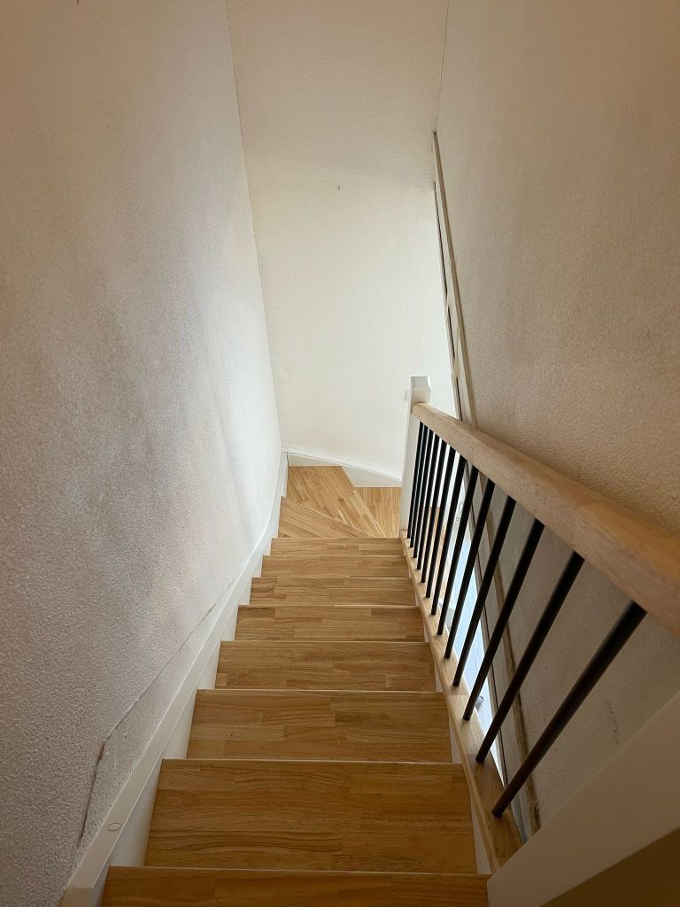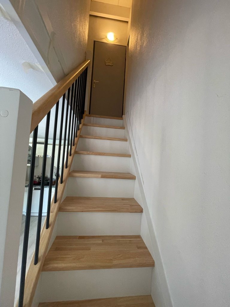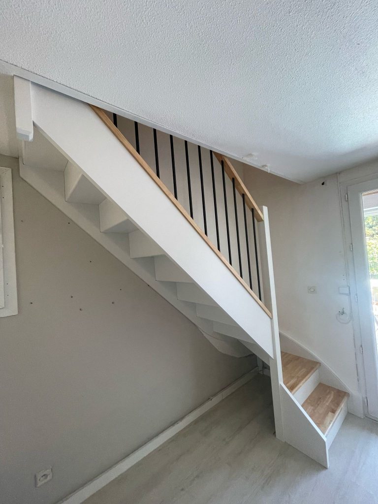 Escalier hévéa peint en blanc,marches vernis barreaux verticaux alu noir