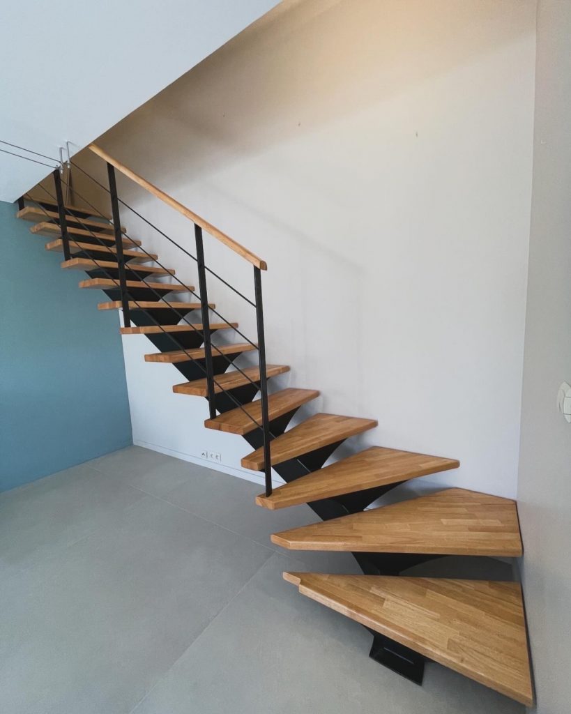 Escalier limon central fer, marches en hévéa vernis et garde-corps en fer avec main courante en bois livré et posé à Tarascon.