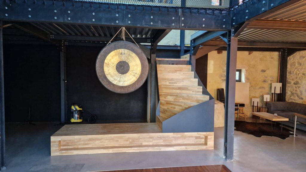 Escalier métal limon à la française, marches et socle départ en hévéa.