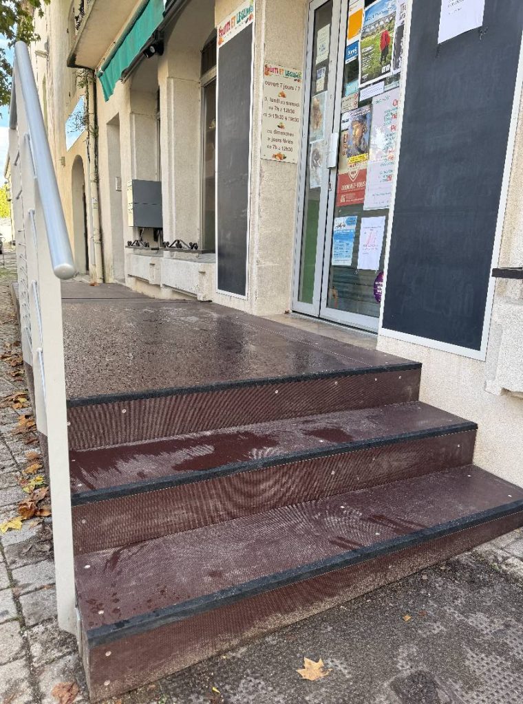 Détails : Réalisation d’une rampe d’accès handicapés pour la superette “Fruits et légumes” dans le centre du village de Caissargues dans le Gard.