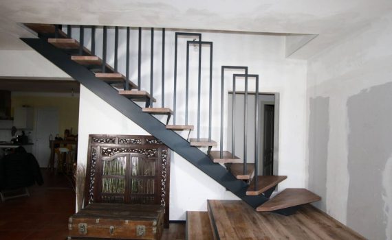 Escalier en fer limon central et marche en hévéa avec rampe en fer sur la commune des Beaux de Provence.