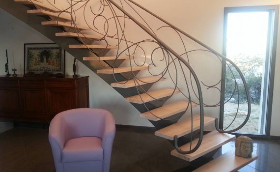 Escalier 2 quarts tournants, limon central métallique débillardé, avec marche hévéa vernis naturel à Aix en provence dans les Bouches du Rhône.