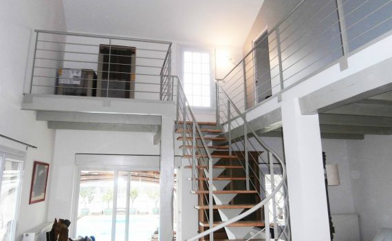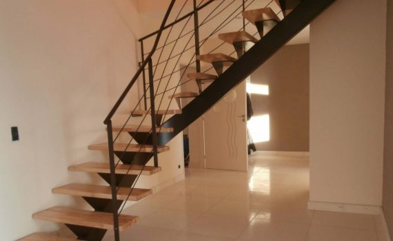 Escalier droit limons métalliques à crémaillères ,marches et contremarche en hévéa vernis naturel. Garde-corps métallique inclinés, finition peinture polyuréthane.